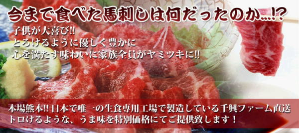 馬肉と言えば本場熊本! 日本で唯一の生食専用工場の千興ファームより直送致します! 熊本の名店。馬肉専門店菅乃屋と同じクオリティをご提供!